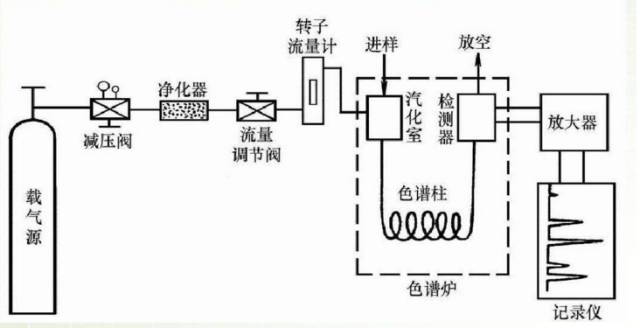 载气从起源钢瓶/气体发生器出来后依次经过减压阀、净化器、气化室、色谱柱、检测器,然后放空。